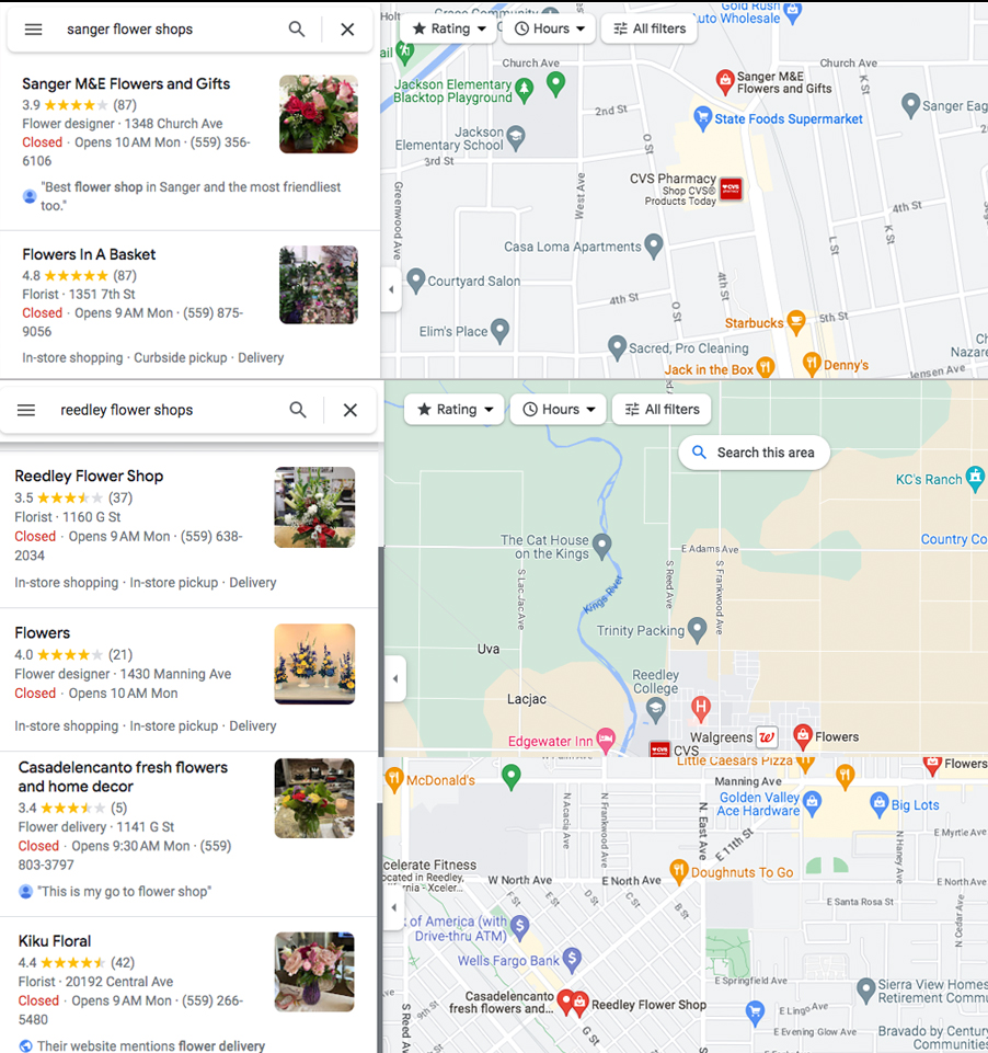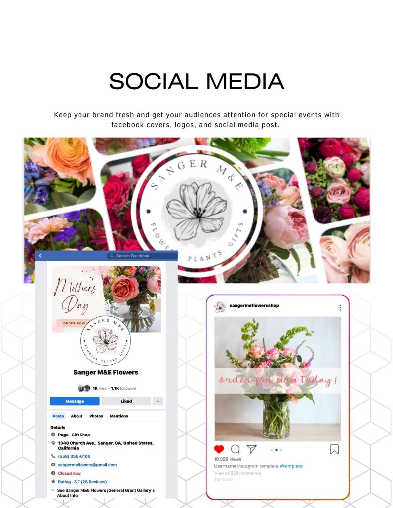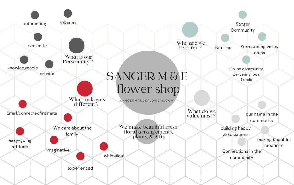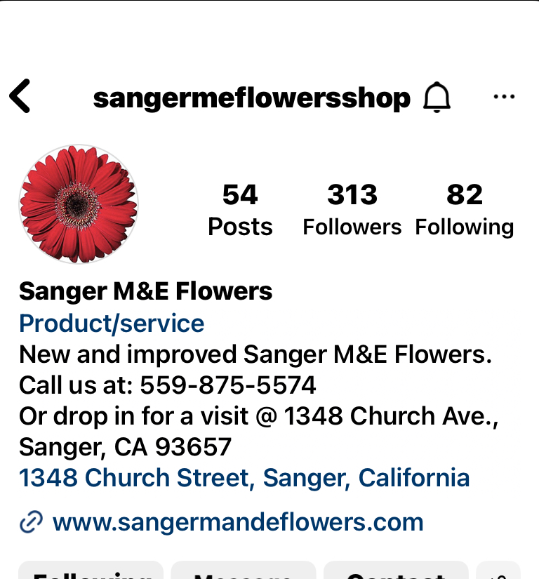 During our chat Eli expressed, the primary goal of Sanger M & E was to continue to build a financially successful flower shop in Sanger, CA. However, they would also like to build awareness within their own community of their new retail location, which offers fresh floral arrangements, plants, and gifts. In addition, they would like to encourage online engagement through the use of Facebook and Instagram, as well as, create a consistent online feel with their brand. Finally, Mark and Eli emphasized that they want to create “good feelings,” in the community associated with their shop, name, and services.