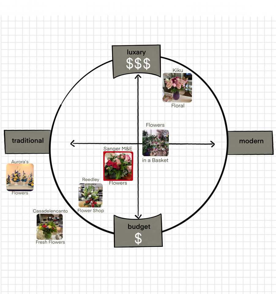 SANGER M & E Flower Shop Verbal: Sanger focused, formal tone of voice, multiple messages Visual: pink daisy, mixed fonts mixed design in multiple locations Price: mid-range (1 doz roses $84.95) | Reedley Flower Shop Verbal: website only, formal generic voice Visual: could not find a logo, or facebook page, generic website Price: lower-range (1 doz roses $78.74) | Kiku Floral Verbal: fun, vibrant, playful, all social media communications esthetically pleasing. Visual: Logo modern, clean design, playful flower, script font. Price: upper range (1 doz roses $99.50) |