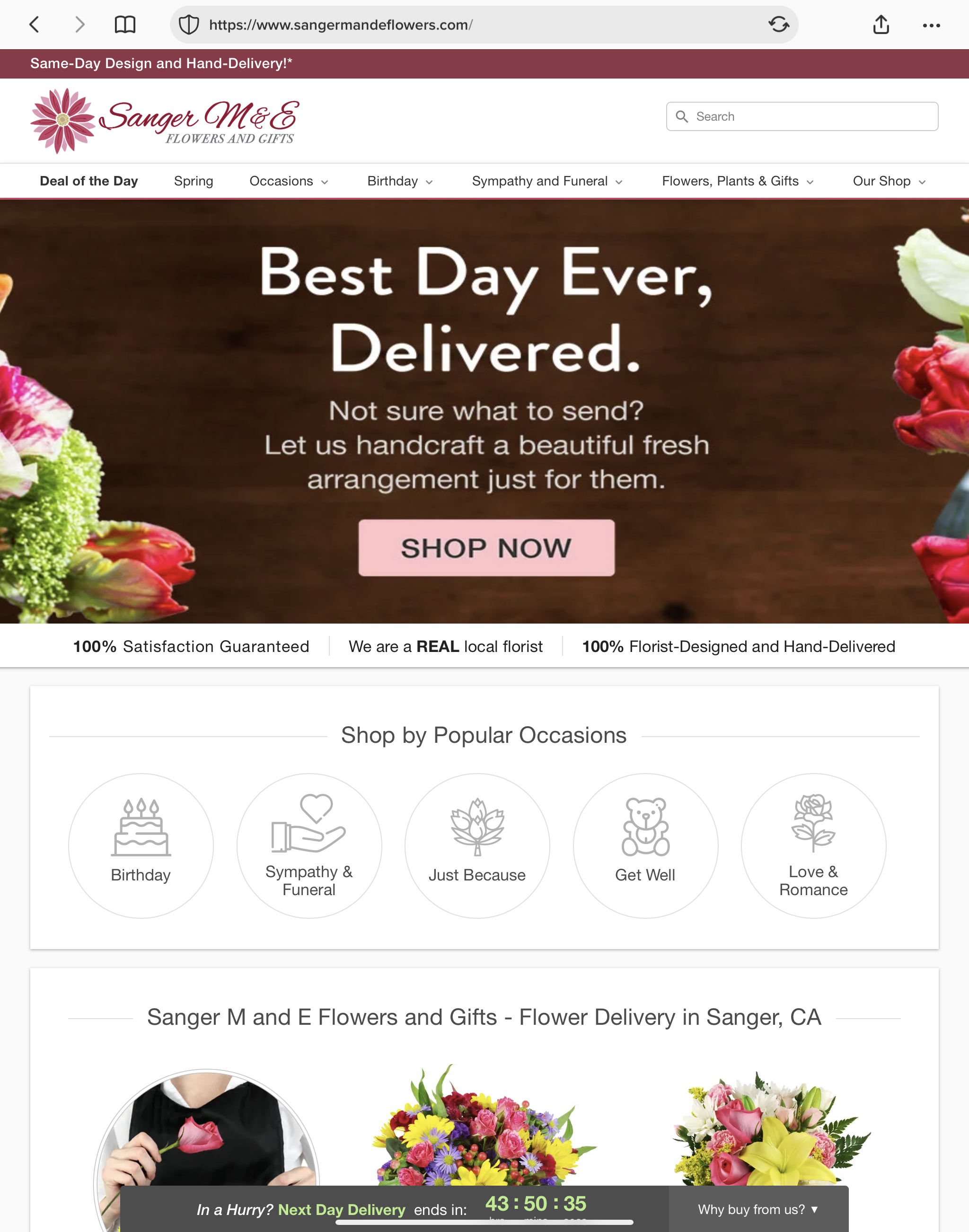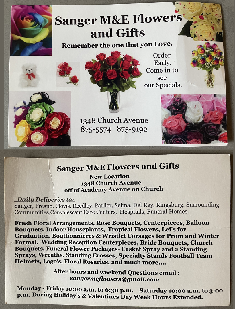 Sanger M & E Flower Shop is one of two shops located in the Sanger area, and one of 5 in the next closest small town of Reedley, CA that share the same service area.
