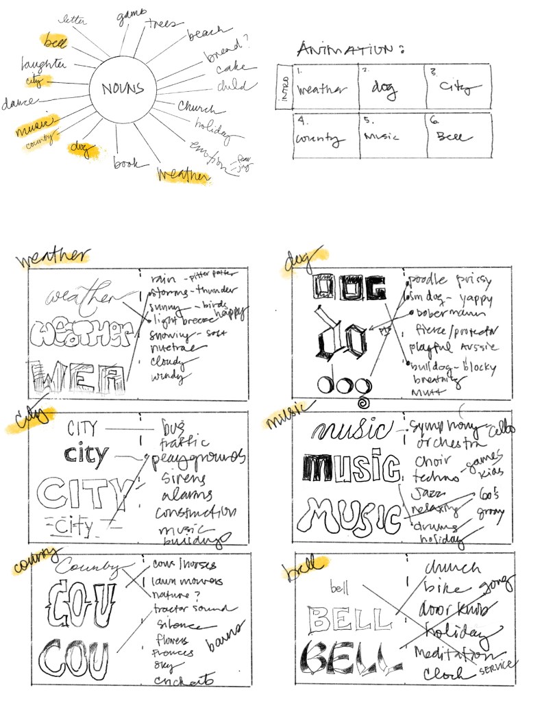 Notice brainstorming created another flurry of creative ideas, and the decision to animate the project was made. However, animation adds another layer of complexity as not only must the nouns be given a mood by their specific font, but also by sound and movement (animation). Sometimes constrictions are helpful to ensure that a project gets done, so in this case, black and white fonts, without embellishments or color, were used. Free fonts were selected from dafont.com, and choices were made within the first 3 pages or so. The sheer amount of fonts can be quite overwhelming, however, dafont is helpful in that you can pick a style and then type the word you would like to see in that font.