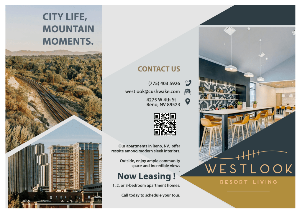The company website summarizes Westlook Resort Living experience in the slogan, “City life, mountain moments.” Therefore, when creating a brochure, it is important that it reflect both: the bustling city of Reno, as well as, the less traveled road.