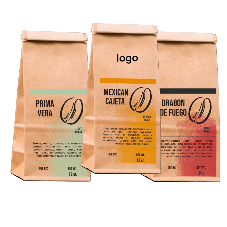 Many small chain coffee shops stamp their own bags, and would be able to use a clear sticker, separate from the logo, that they could customize to the type of bean they are selling.