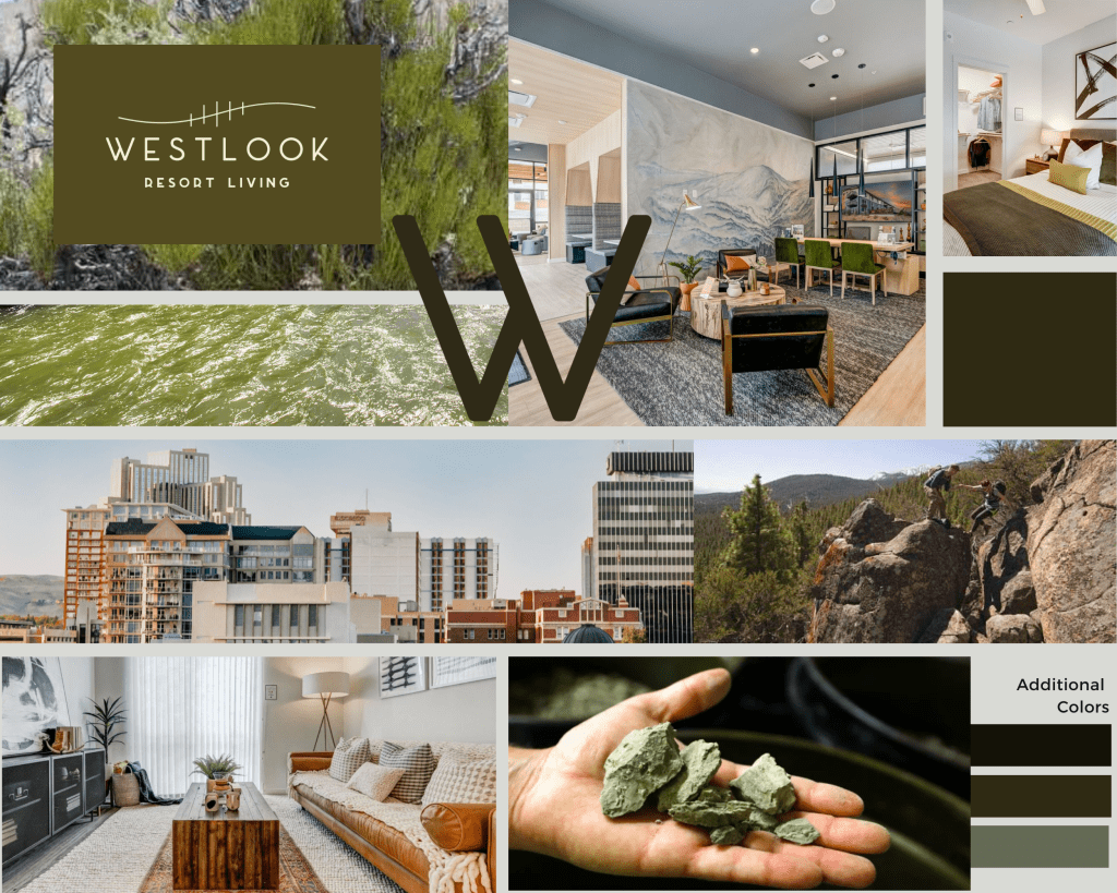 Mood board inspired by the rich greens, reflected in the nearby Truckee River. The river is located across the street from the complex, and it’s banks are surrounded by natural brush boasting several shades of green.