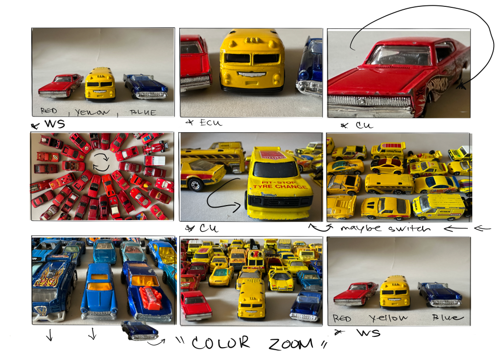 Well, this was definitely more difficult than I thought it would be! Having shot photography, I was surprised at just how much time it took to set the animation stage and then how much more time the actual process of shooting each frame took. Although a little stressful, the test made me realize for my final project I have to find a better way to rig my lighting to give a more consistent look to project. In addition, I realized that it will be very important to rely on my storyboards and have a clear idea where I am going well before I lay out the cars. In fact, I could see it being a good idea to do another quick storyboard breaking down the larger ideas into smaller pieces. Finally, I quickly realized how every little adjustment will show in the final outcome, and I must be careful to only move items in the way they need to be moved. Although this has a long way to go, I do see potential with the idea itself.