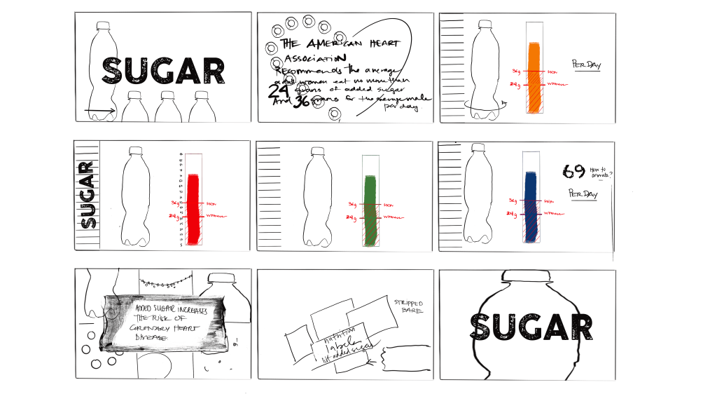 What is your objective to the piece– bring awareness to the recommended daily amount of sugar, and the excessive amounts of added sugar in various sodas.