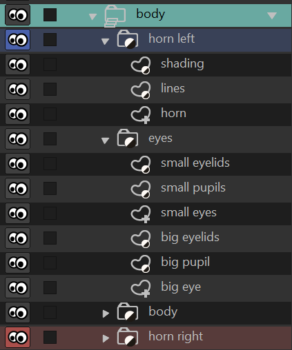 You can open (expand) the Body group and see that it contains Horn Left and Eyes, which are themselves groups. Inside these groups are your actual artwork layers, like lines, shading, or other vector elements.