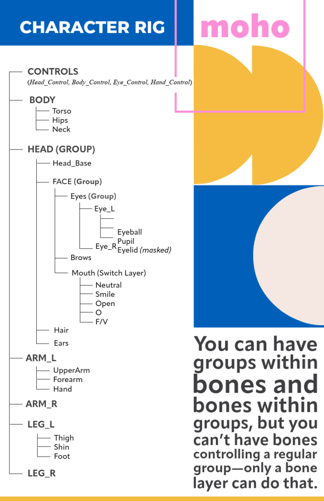 A Bone Layer is a special type of group that let’s you animate characters using bones. think of it as a special container in Moho: it holds all the artwork you want to animate—like arms, legs, or eyes—while also storing the skeleton data (the bones and how they’re connected).